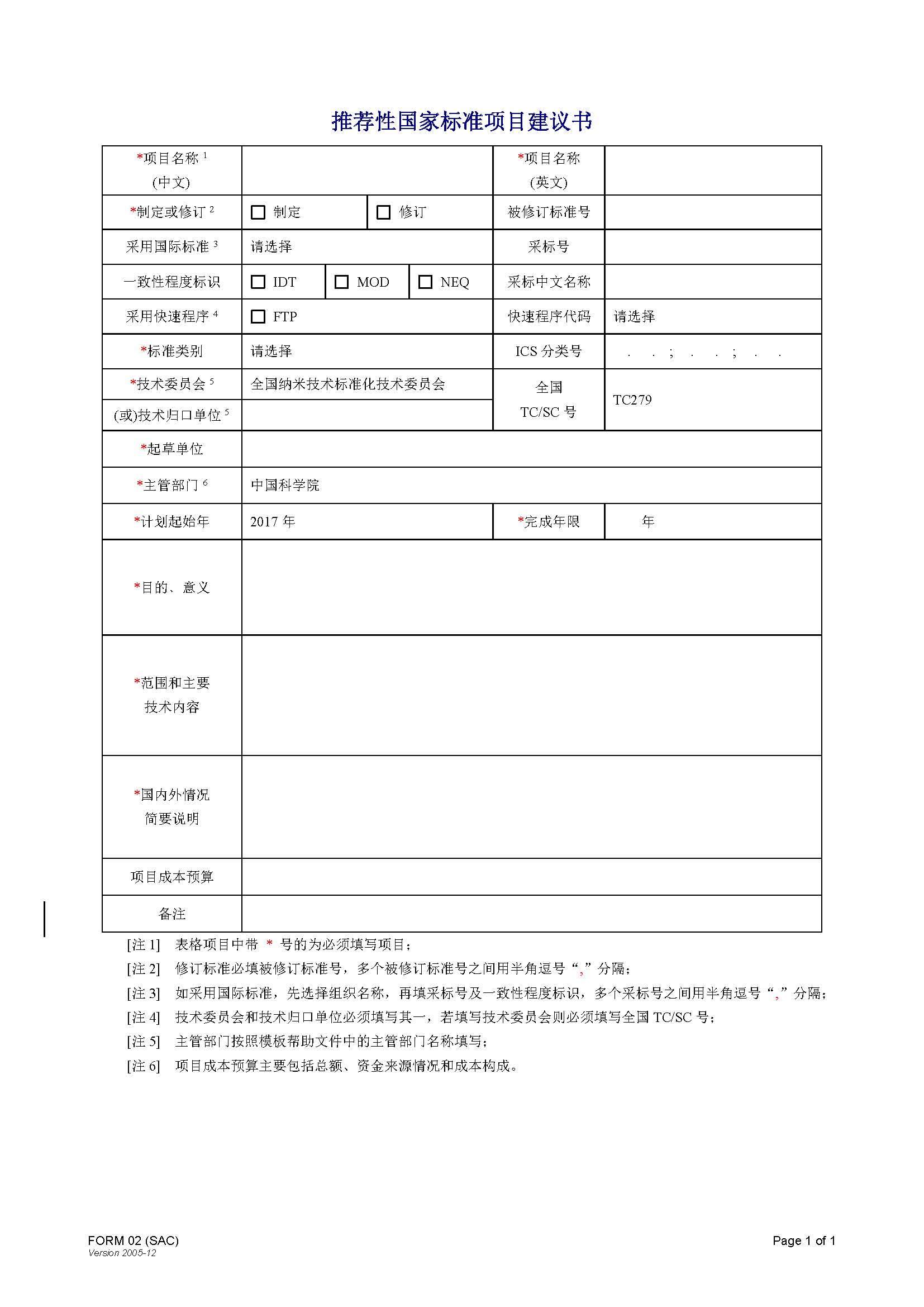 低維半導(dǎo)體器件、鈣鈦礦、石墨烯、量子點(diǎn)、納米線等)行業(yè)發(fā)展?fàn)顩r,在分析現(xiàn)有國家和行業(yè)標(biāo)準(zhǔn)的基礎(chǔ)上,圍繞低維納米技術(shù)基礎(chǔ)標(biāo)準(zhǔn)、檢測方法標(biāo)準(zhǔn)、產(chǎn)品標(biāo)準(zhǔn)、原料質(zhì)量規(guī)格標(biāo)準(zhǔn)、功效評價(jià)標(biāo)準(zhǔn)、質(zhì)量控制規(guī)范、環(huán)保安全儲運(yùn)標(biāo)準(zhǔn)等重點(diǎn)領(lǐng)域,進(jìn)行認(rèn)真研究,提出擬制修訂標(biāo)準(zhǔn)項(xiàng)目,填寫《國家標(biāo)準(zhǔn)項(xiàng)目建議書》(見圖1),并于9 月28 日前將圖1 提交至工作組秘書處。