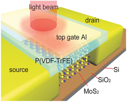 最近,中國科學院上海技術物理研究所王建祿副研究員、胡偉達研究員將P(VDF-TrFE)鐵電聚合物材料沉積在二維材料MoS2表面,利用鐵電聚合物材料極強的鐵電極化場,實現了對少層MoS2的完全耗盡。在光電特性表征中,他們發現這種超強局域場可使得MoS2原子晶格重新排布,禁帶寬度變小。基于該結構,他們報道了MoS2材料在短波紅外光電響應,研制出了高性能的可見-紅外光電探測器件。研究發現該結構MoS2光電探測器具有高響應率(達到2570A/W),高探測率(2.2×1012Jones),低功耗(0柵壓),寬波段探測(可見-1550nm),快速響應等特點,相關成果近期發表于《Advanced Materials》上。據巨納集團低維材料在線91cailiao.cn的技術工程師Ronnie介紹,這種利用鐵電極化局域場操控二維材料光電特性新方法,為推進二維材料在光電子器件及電子器件等領域的應用提供了新思路。