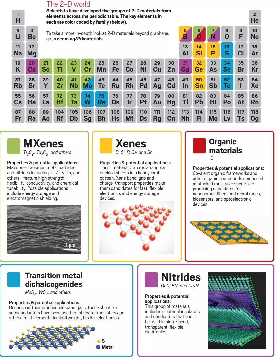 自2010年石墨烯獲得諾貝爾物理學(xué)獎以來,科學(xué)家和產(chǎn)業(yè)界對石墨烯就開始狂熱的追逐。和石墨的不同之處在于:石墨烯僅有一個碳原子層厚度,并表現(xiàn)出超優(yōu)異的力學(xué)、電學(xué)等性能。在追逐石墨烯的同時,一大批類石墨烯的二維材料也被相繼發(fā)現(xiàn),從元素周期表來看,組成這些二維材料元素主要包括:過渡金屬、碳族元素、硫族元素以及其他。這些納米厚度的二維材料和石墨烯一樣,具有和體相材料截然不同的新性能.