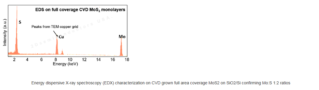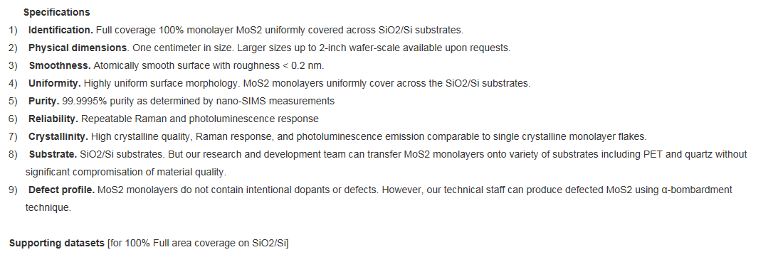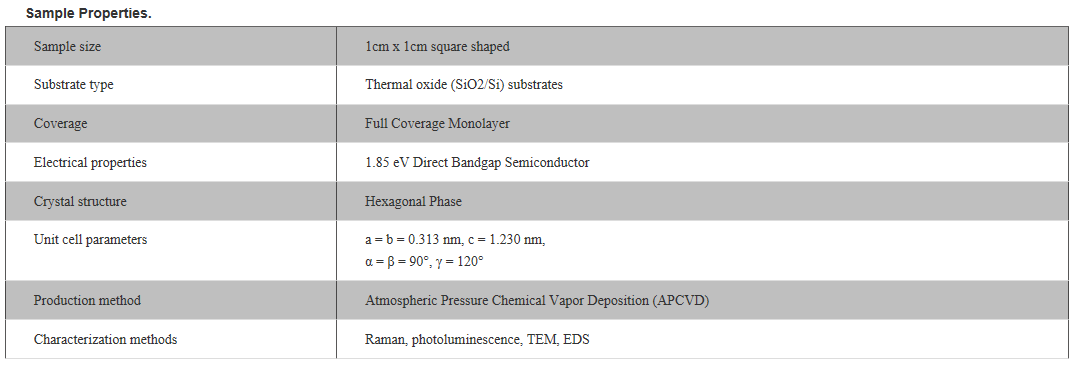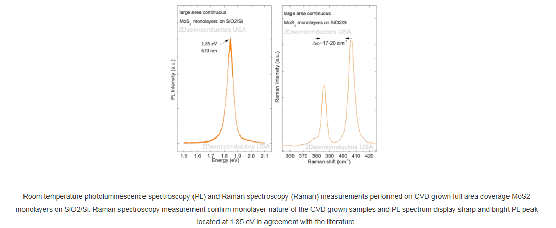 This product contains full area coverage MoS2 monolayers on SiO2/Si substrates. Sample size measures 1cm in size and the entire sample surface contains monolayer thick MoS2 sheet. Synthesized full area coverage monolayer MoS2 is highly luminescent and Raman spectroscopy studies also confirm the monolayer thickness. In comparison to full area coverage MoS2 on sapphire, full area coverage MoS2 on SiO2/Si display higher PL intensity.