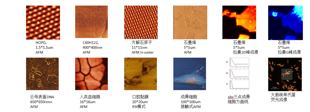 掃描隧道顯微鏡/ 原子力顯微鏡(接觸 +半接觸+非接觸)/橫向力顯微鏡/相位成像/力調制/力譜線/粘附力成像/磁力顯微鏡/靜電力顯 微鏡/掃描電容顯微鏡/開爾文探針顯微鏡/擴展電阻成像/納米壓痕/刻蝕: 原子力顯微鏡(電壓+力)/壓電力模式/超聲原子力/外加磁場/溫度控制/氣氛控制等功能。