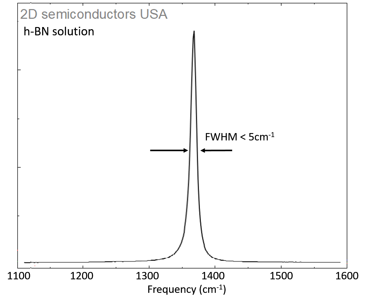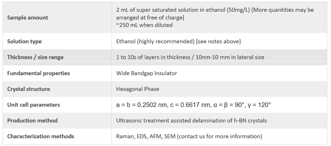 This product contains h-BN mono- and few-layer flakes solution in ethanol. The h-BN solution has been developed by ultrasonic treatment of h-BN high quality crystals synthesized through cubic anvil device high pressure growth technique. Since the starting material h-BN is highly crystalline, ultrasonic treatment to delaminate h-BN layers yields highly crystalline h-BN mono-, few-, and some thick layers suspended in ethanol solution. The crystallinity of h-BN nanomaterials has been confirmed through electron energy dispersive spectroscopy (EDAX), Raman spectroscopy (FWHM<5 cm-1), and scanning electron microscopy (SEM) measurements. Lateral sizes of h-BN flakes deposited onto different substrates range from ~25nm - ~10 mm while thickness range from 1L to 10s of layers.