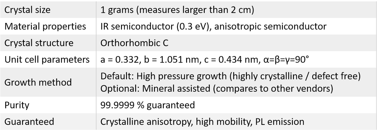 We offer most economic, massive size (0.5 grams), and highly crystalline scientific grade black phosphorus (BPs) crystals. Black phosphorus is an infrared (IR) semiconductor with a band gap of 0.3 eV in bulk which becomes ~1 eV when isolated down to monolayer (phosphorene). Our crystals are grown using special techniques (see below) in order to attain high crystalline anisotropy, minimal crystal defect density in the range of a record 3E9 - 1E10 cm-2 values, and high electronic / optical anisotropy. Thus, our crystals come ready for exfoliation with guaranteed crystalline, optical, and electronic anisotropy. Crystals are packaged under argon and is tightly seal to retain intrinsic properties of BPs crystals.