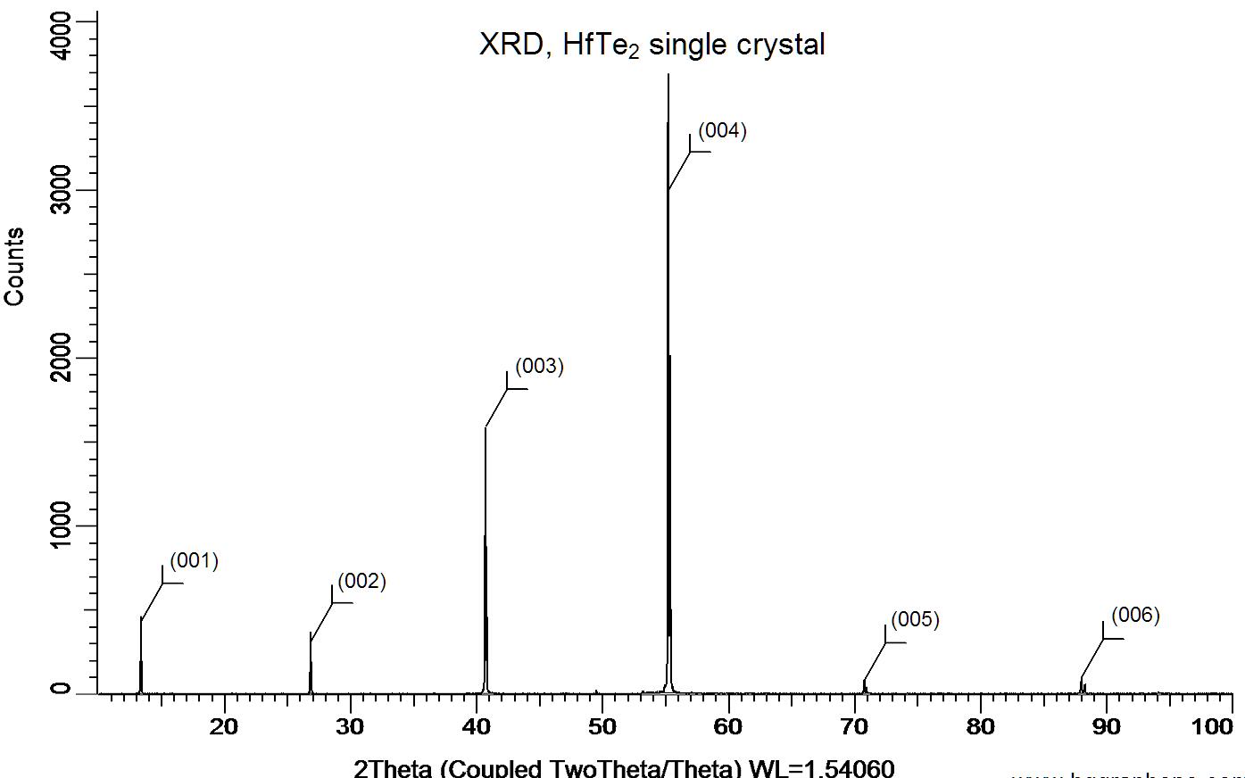 X-ray diffraction on a HfTe2 single crystal aligned along the (001) plane. XRD was performed at room temperature using a D8 Venture Bruker. The 6 XRD peaks correspond, from left to right, to (00l) with l = 1, 2, 3, 4, 5, 6